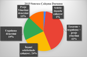 2023 yılına kadar yapmış olduğumuz anketlerden elde ettiğimiz sonuçlara göre, mezunlarımızın %31’i çok uluslu projelerde çalışmaktadır (Şekil 1). Mezunlarımız Amerika, Rusya, İtalya, BAE, Suudi Arabistan gibi ülkelerde veya Türkiye’deki metro, havaalanı gibi büyük veya küçük ölçekli değişik projelerde kariyerlerini sürdürmektedirler. Mezunlarımız sektörde tasarım mühendisi, yapım, proje yönetimi olmak üzere her alanda çalışmaktadır (Şekil 2). Mezunlarımızın %39’u, yönetici pozisyonlarda çalışmakta olup, bunların %38'i uluslararası projelerde yetki ve sorumluluk üstlenmişlerdir (Şekil 3). Mezunlarımızın büyük bölümü çalışma hayatında yer alırken, bir bölümü de yüksek lisans eğitimine devam etmektedirler. Tüm mezunlarımızın %36’sı yüksek lisans yapmakta, bunların %19’u yurt dışı bir eğitim kurumunda yüksek lisans yapmaktadır (Şekil 4). Yüksek lisans için İngiltere, İtalya ve Amerika’daki çeşitli üniversitelere giden, yurt içinde ise ağırlıklı olarak Boğaziçi Üniversitesi, İstanbul Teknik Üniversitesi, Yıldız Teknik Üniversitesi’nde eğitimine devam edenler mevcuttur. Ayrıca, eğitimini tamamladıktan sonra kendi aile şirketlerinde yer alan veya belirli bir deneyim kazandıktan sonra kendi firmasını kuran bir çok mezunumuz da vardır.